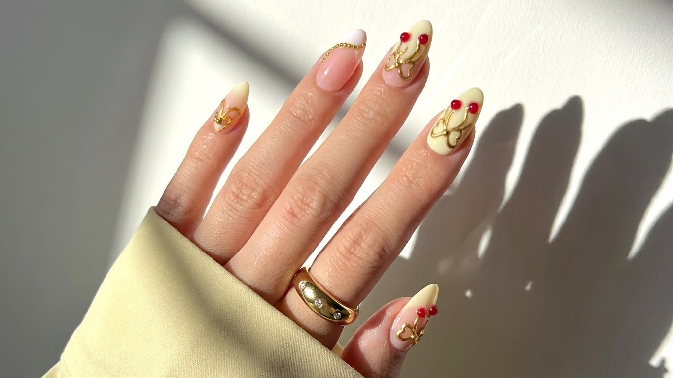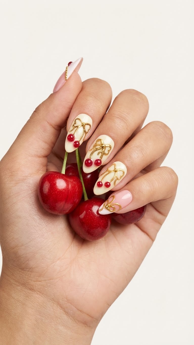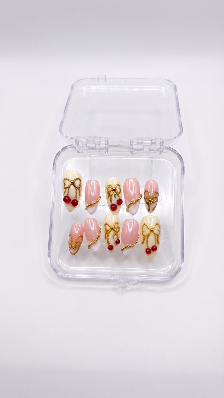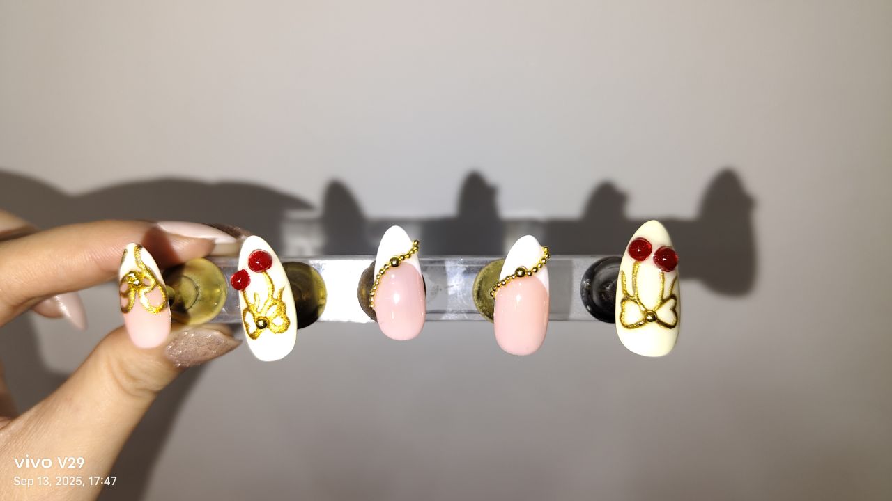 Handmade Press-On Nails | Salon Finish | Medium Size | Set of 12 Product Details Type: Handmade Press-On Nails Set Size: 12 Nails Size: Medium Length: Customized Shape: Almond Color & Design Premium 3d cherry chrome with butter yellow and light pink base, golden bead white French tips , heavy designer Unique heavy design Elegant, modern and versatile look Quality & Finish 100% handmade by professional nail artists Salon-made & UV-cured for long-lasting shine and strength Smooth edges with a natural fit Lightweight, durable and reusable High-gloss gel finish Why You’ll Love It Salon-quality nails in minutes Comfortable for daily wear Suitable for parties, festivals, work and gifting No drying time, no nail damage What You Get 1 Set of 12 handmade press-on nails (Medium) 6-piece press-on nail application kit