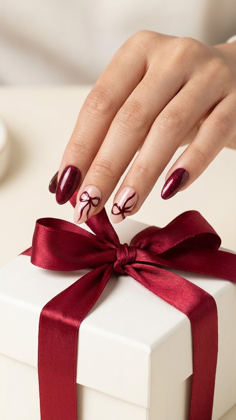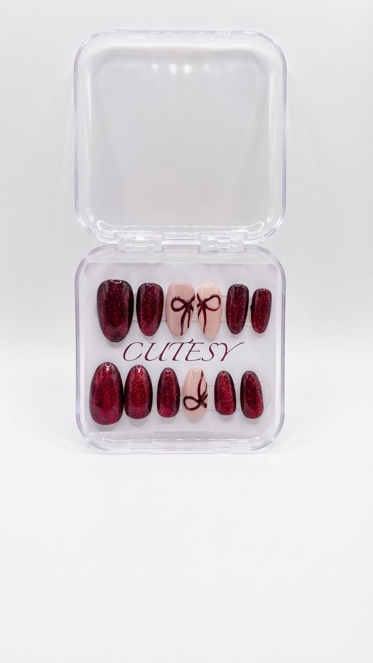 Product Details : Red Cateye with touch of black base and half bow on 2 fingers Type: Handmade Press-On Nails Set Size: 12 Nails Size: Medium Length: Medium Shape: Almond Color & Design: Red cateye on black base with half bow Accent nails with hand-crafted pearl heart detailing Elegant, romantic and premium finish Quality & Finish 100% handmade by professional nail artists Salon-made & UV-cured for long-lasting shine and strength Smooth edges, natural curve, lightweight feel High-gloss gel finish, chip-resistant and reusable Why You’ll Love It Salon-like manicure in minutes Comfortable for daily wear Perfect for parties, dates, festivals and gifting No drying time, no nail damage What You Get 1 Set of 12 handmade press-on nails (Medium) 6 piece application kit set