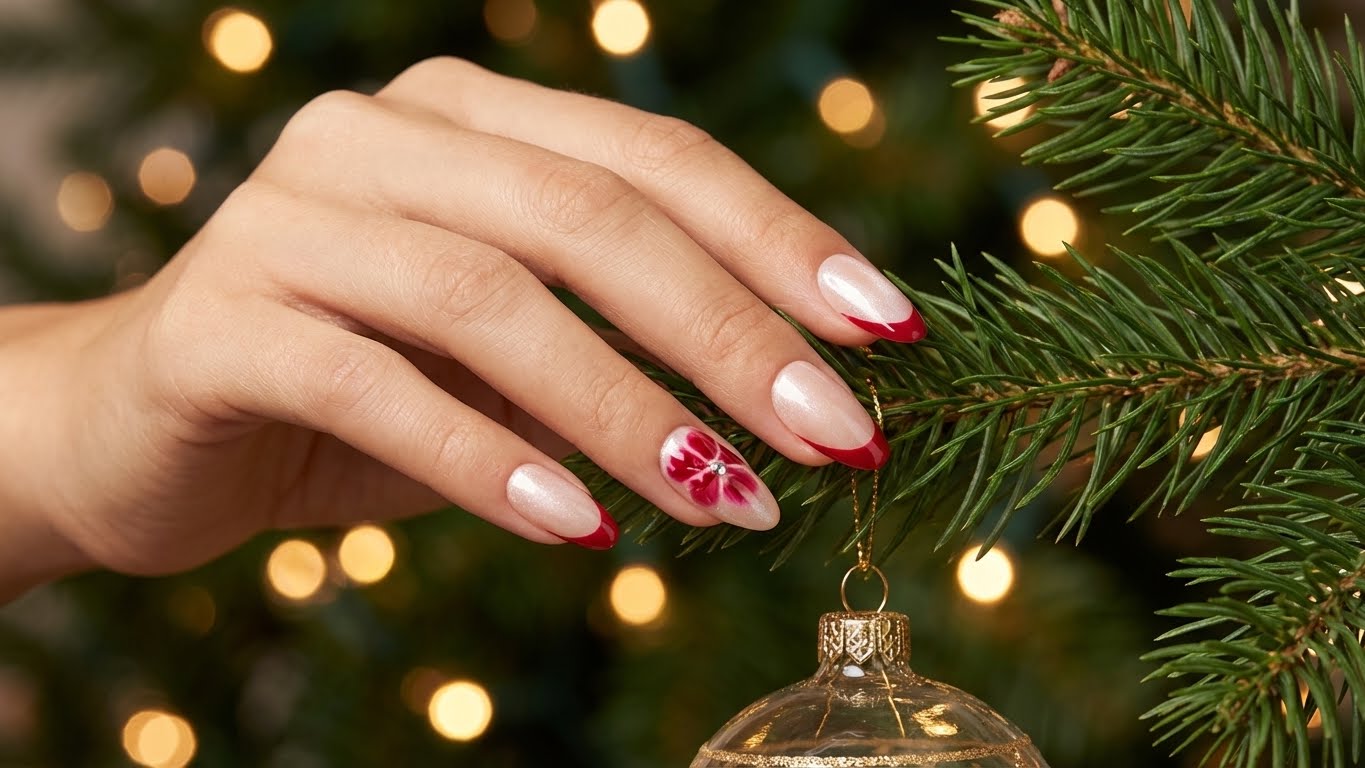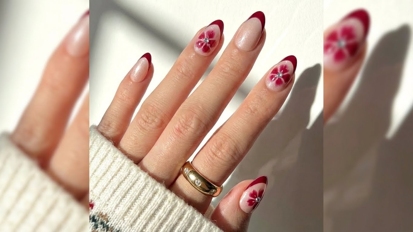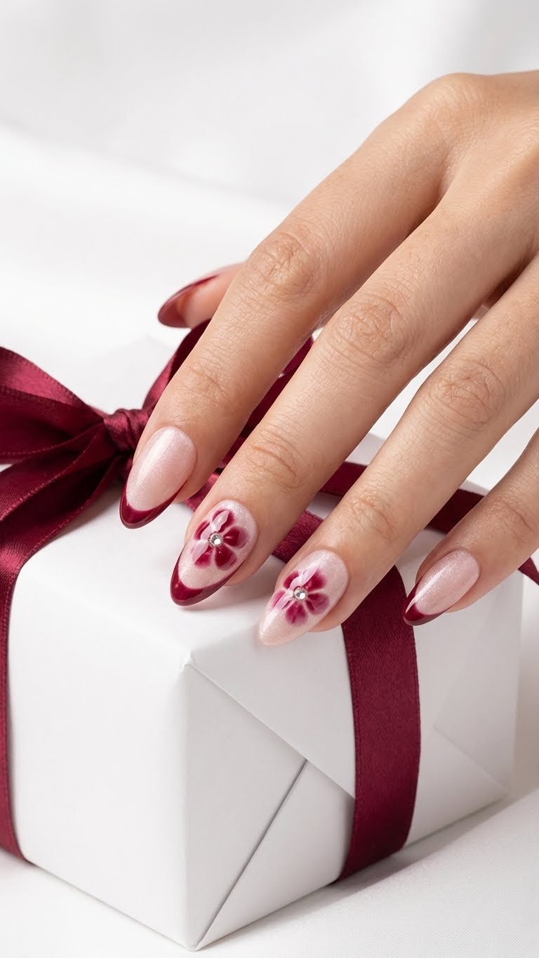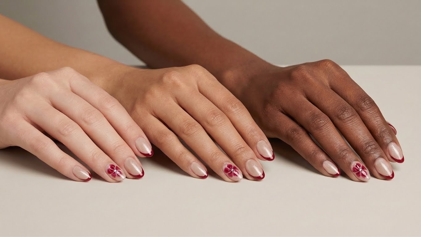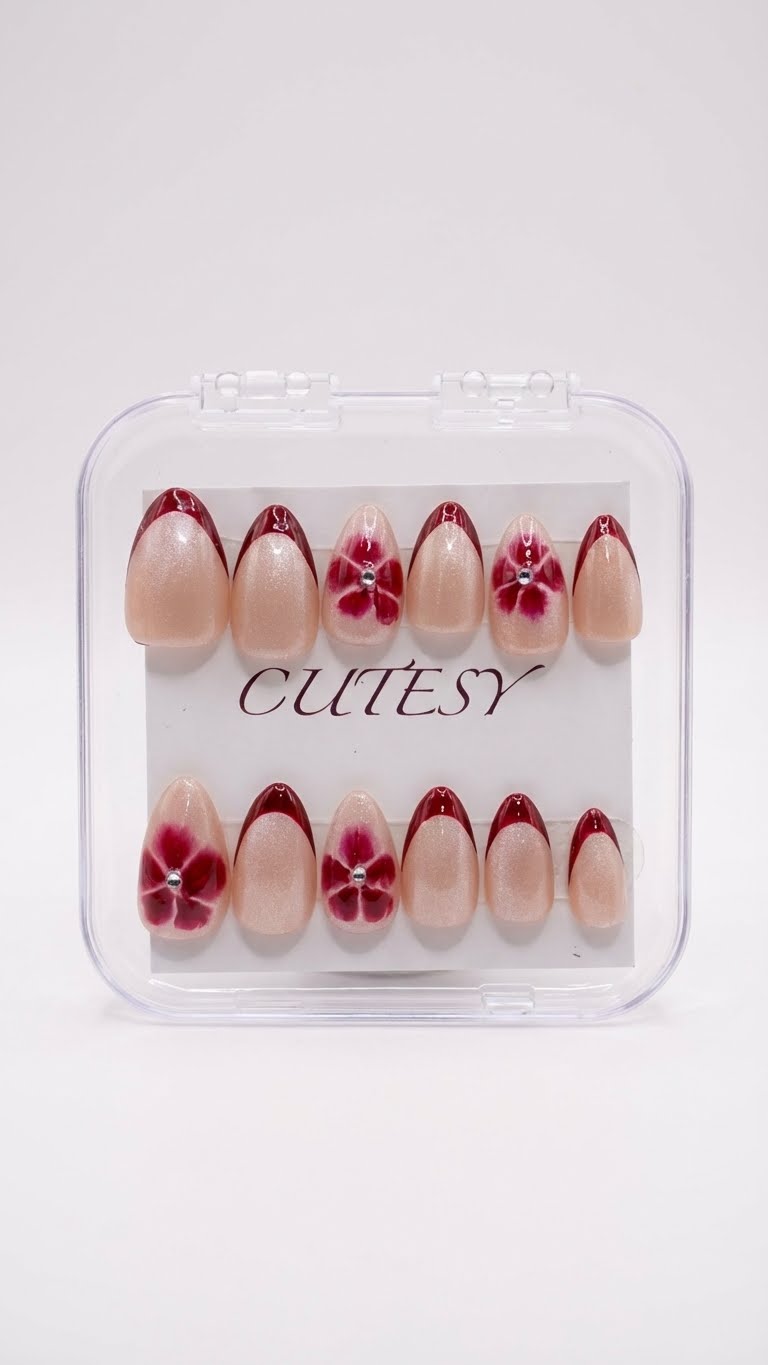 Product Details : Nude Base Silver Cateye with Wine French tips and flower with rhinestone Type: Handmade Press-On Nails Set Size: 12 Nails Size: Medium Length: Short Medium Shape: Almond Color & Design Deep burgundy red tips with nude base and silver cat eye Nude accent nails with hand-crafted flower detailing Elegant, romantic and premium finish Quality & Finish 100% handmade by professional nail artists Salon-made & UV-cured for long-lasting shine and strength Smooth edges, natural curve, lightweight feel High-gloss gel finish, chip-resistant and reusable Why You’ll Love It Salon-like manicure in minutes Comfortable for daily wear Perfect for parties, dates, festivals and gifting No drying time, no nail damage What You Get 1 Set of 12 handmade press-on nails (Medium) 5 piece application kit set