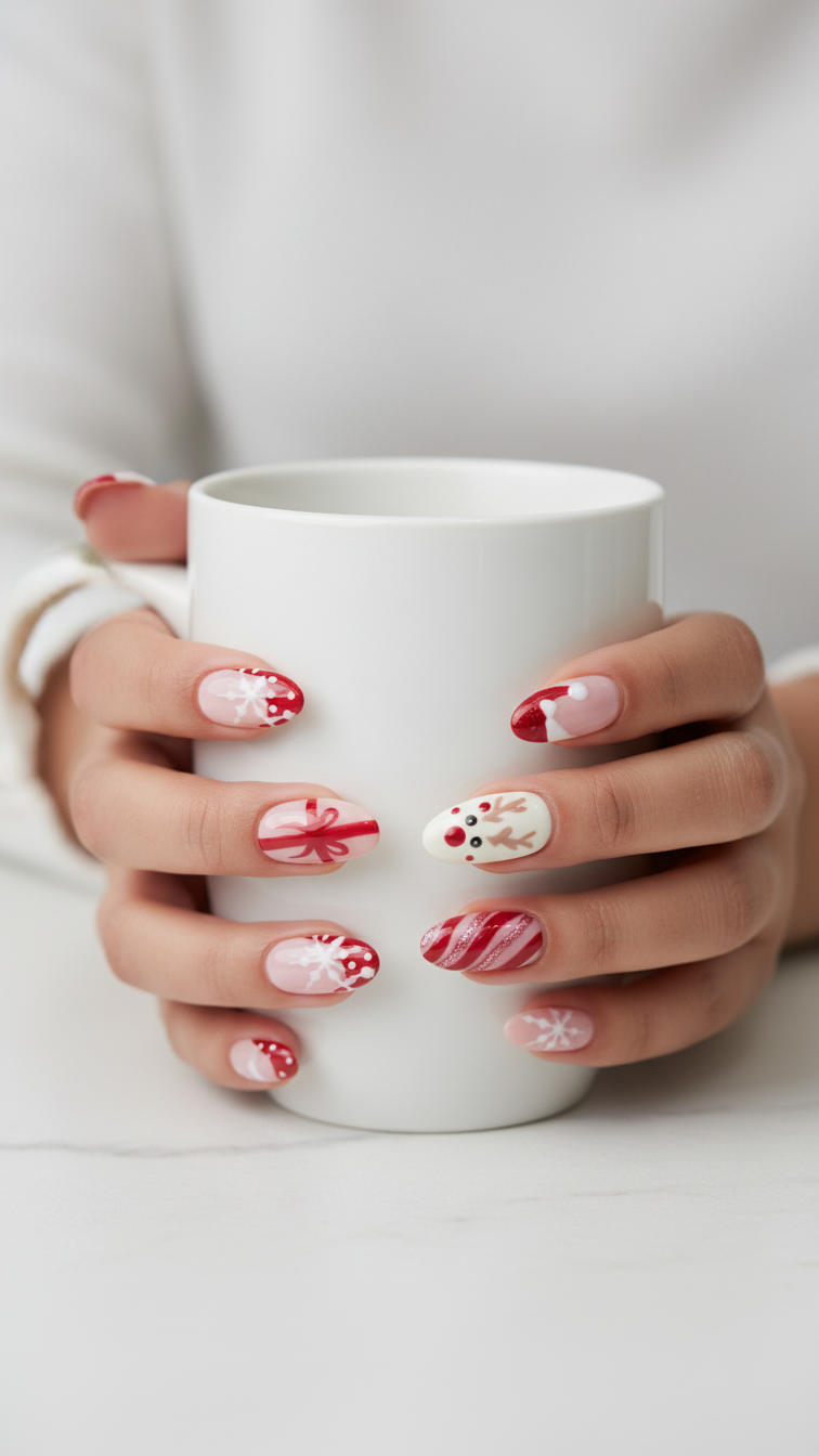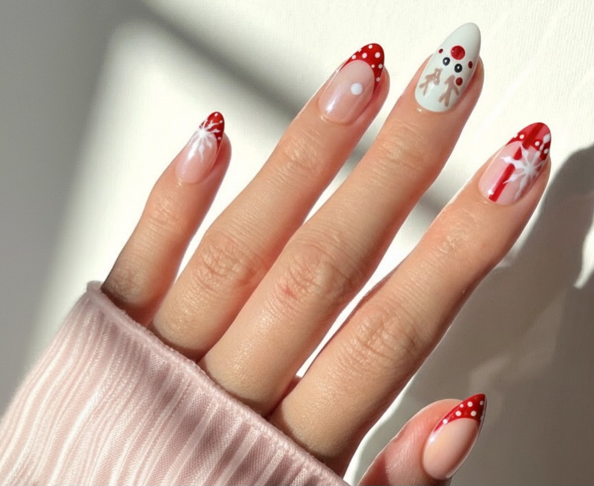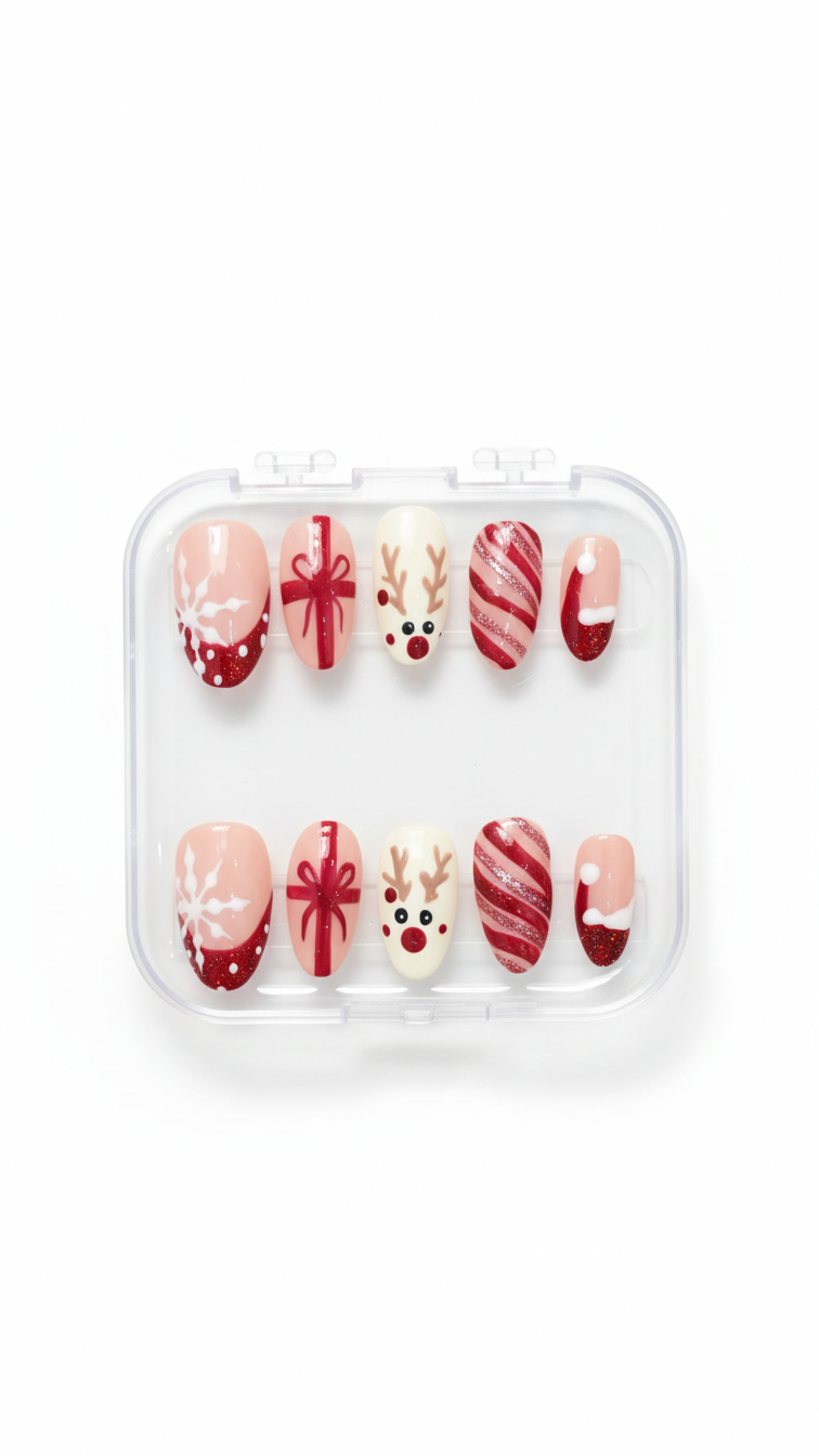 Product Details : Detailed Christmas Nail Art Type: Handmade Press-On Nails Set Size: 12 Nails Size: long almond Length: Medium Shape: Almond Color & Design Christmas Nail Nude accent nails with hand-crafted pearl heart detailing Elegant, romantic and premium finish Quality & Finish 100% handmade by professional nail artists Salon-made & UV-cured for long-lasting shine and strength Smooth edges, natural curve, lightweight feel High-gloss gel finish, chip-resistant and reusable Why You’ll Love It Salon-like manicure in minutes Comfortable for daily wear Perfect for parties, dates, festivals and gifting No drying time, no nail damage What You Get 1 Set of 12 handmade press-on nails (Medium) 6 piece application kit set