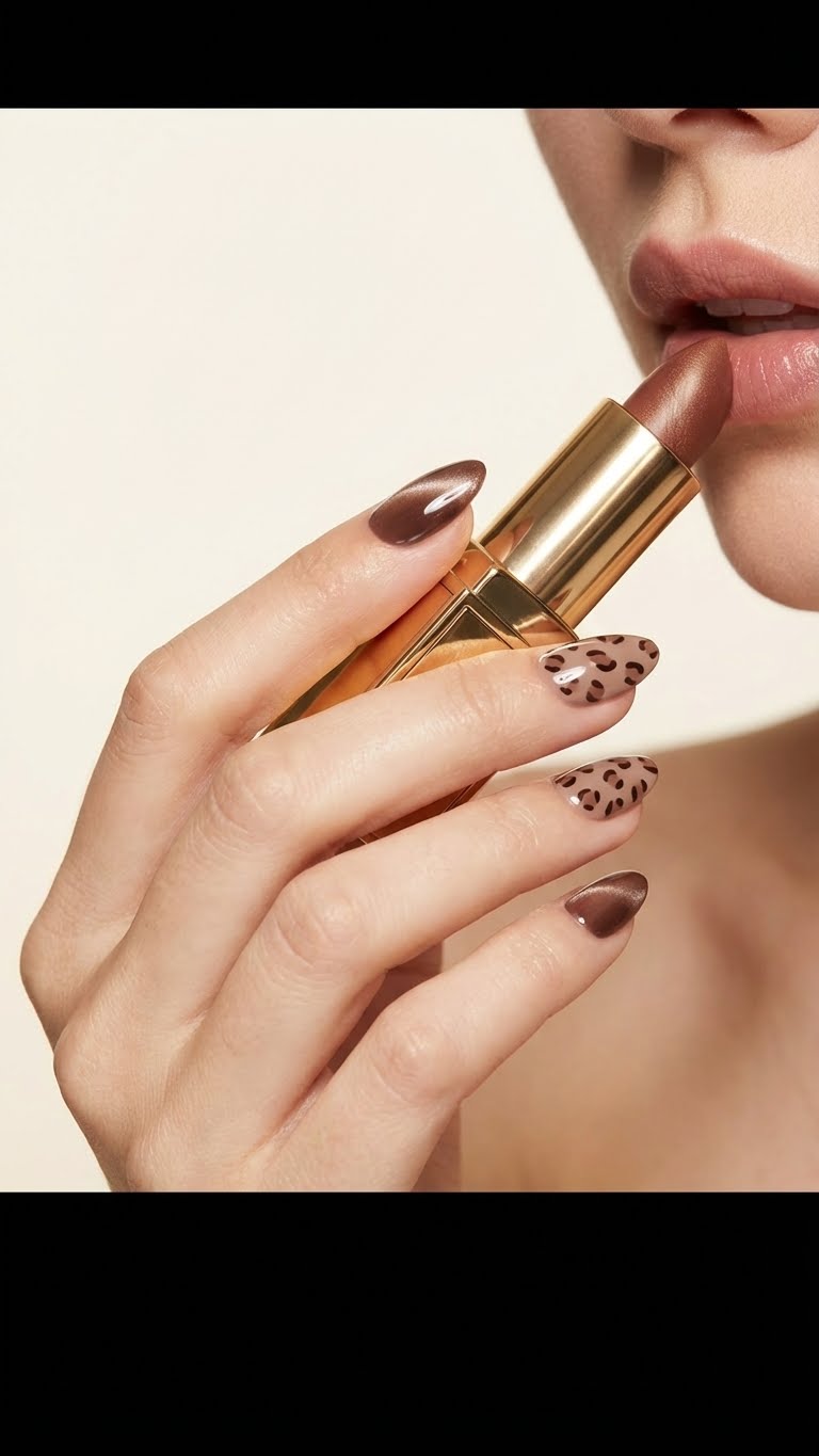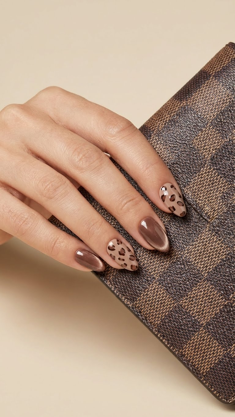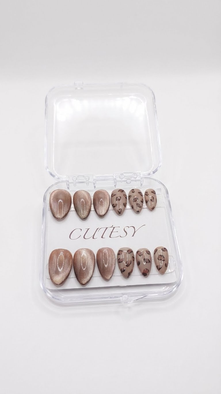 Product Details : Brown Cateye with leopard blooming gel art Type: Handmade Press-On Nails Set Size: 12 Nails Size: Short Length: Medium Shape: Almond Color & Design: Cateye Lepord Nail Art Accent nails with hand-crafted pearl heart detailing Elegant, romantic and premium finish Quality & Finish 100% handmade by professional nail artists Salon-made & UV-cured for long-lasting shine and strength Smooth edges, natural curve, lightweight feel High-gloss gel finish, chip-resistant and reusable Why You’ll Love It Salon-like manicure in minutes Comfortable for daily wear Perfect for parties, dates, festivals and gifting No drying time, no nail damage What You Get 1 Set of 12 handmade press-on nails (Medium) 6 piece application kit set