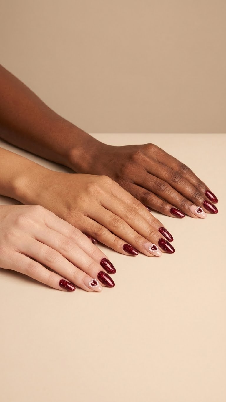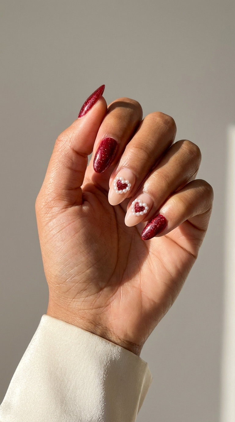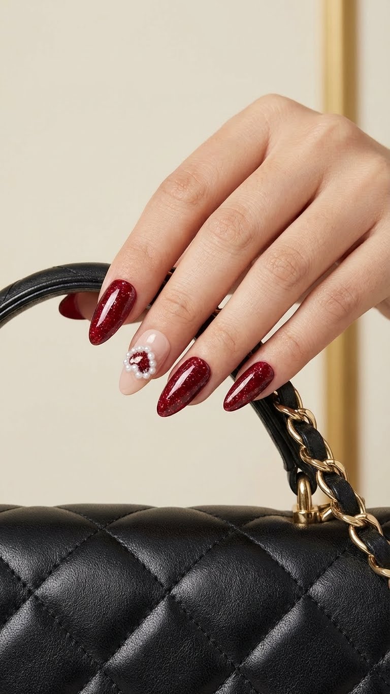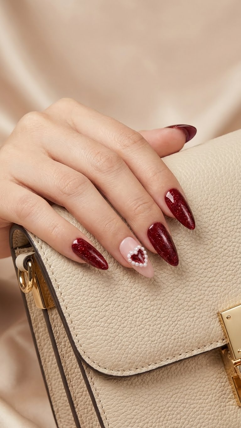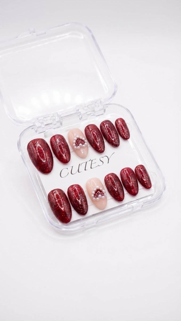 Product Details : Sparkling Red Cateye with pearl heart Type: Handmade Press-On Nails Set Size: 12 Nails Size: Medium Length: Medium Shape: Almond Color & Design Deep burgundy red with subtle shimmer Nude accent nails with hand-crafted pearl heart detailing Elegant, romantic and premium finish Quality & Finish 100% handmade by professional nail artists Salon-made & UV-cured for long-lasting shine and strength Smooth edges, natural curve, lightweight feel High-gloss gel finish, chip-resistant and reusable Why You’ll Love It Salon-like manicure in minutes Comfortable for daily wear Perfect for parties, dates, festivals and gifting No drying time, no nail damage What You Get 1 Set of 12 handmade press-on nails (Medium) 6 piece Nail application kit