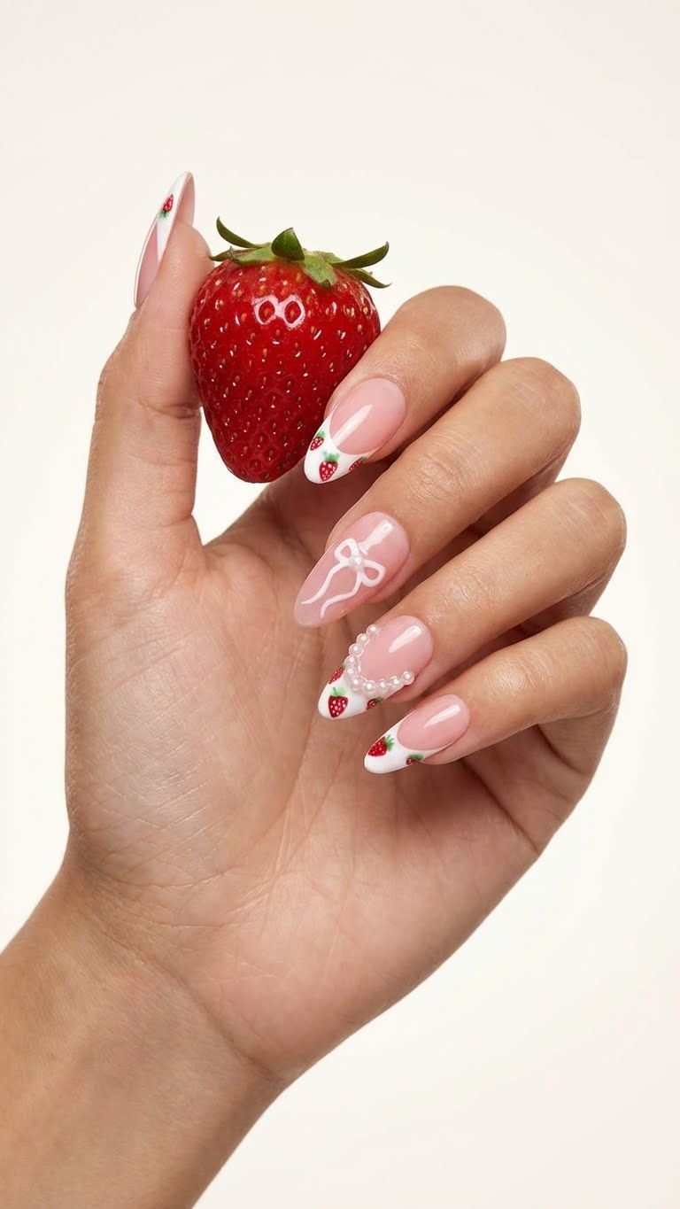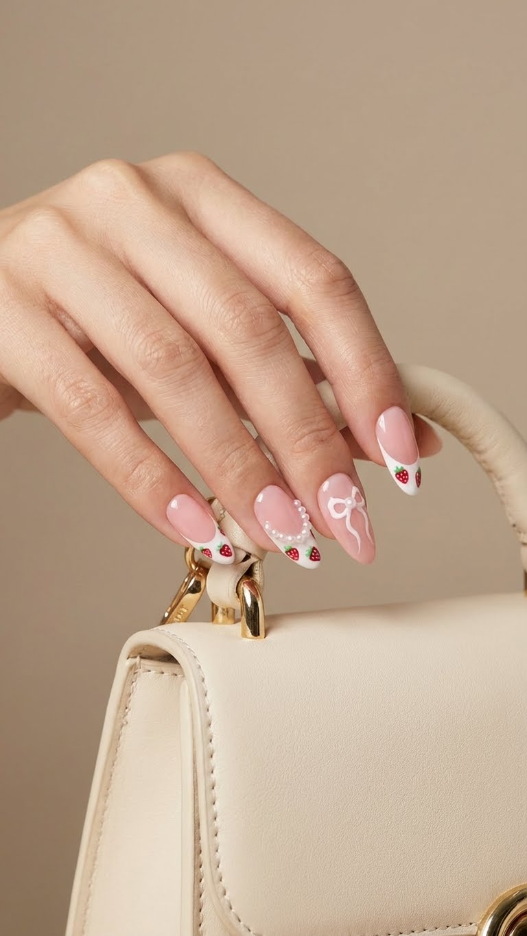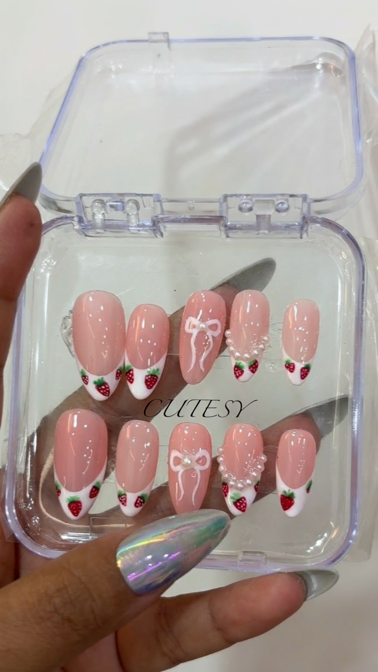 Handmade Press-On Nails | Salon Finish | Medium Size | Set of 12 Product Details Type: Handmade Press-On Nails Set Size: 12 Nails Size: Medium Length: Medium Shape: Almond Color & Design Premium nails with French tips with strawberry nail art and pearl 3d look with bow Designer Elegant, modern and versatile look Quality & Finish 100% handmade by professional nail artists Salon-made & UV-cured for long-lasting shine and strength Smooth edges with a natural fit Lightweight, durable and reusable High-gloss gel finish Why You’ll Love It Salon-quality nails in minutes Comfortable for daily wear Suitable for parties, festivals, work and gifting No drying time, no nail damage What You Get 1 Set of 12 handmade press-on nails (Medium) 6-piece press-on nail application kit