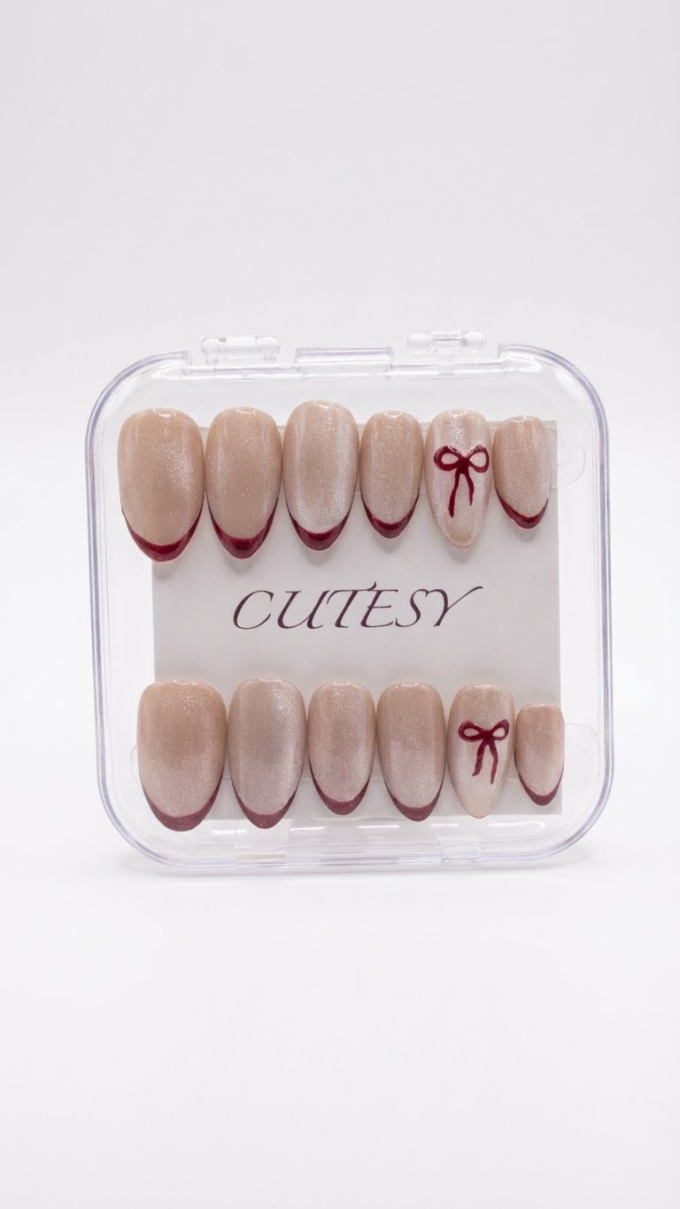Product Details : Nude Base Silver Cateye with a bow Type: Handmade Press-On Nails Set Size: 12 Nails Size: Medium Length: Medium Shape: Almond Color & Design: Cateye French Tips with bow Accent nails with hand-crafted pearl heart detailing Elegant, romantic and premium finish Quality & Finish 100% handmade by professional nail artists Salon-made & UV-cured for long-lasting shine and strength Smooth edges, natural curve, lightweight feel High-gloss gel finish, chip-resistant and reusable Why You’ll Love It Salon-like manicure in minutes Comfortable for daily wear Perfect for parties, dates, festivals and gifting No drying time, no nail damage What You Get 1 Set of 12 handmade press-on nails (Medium) 6 piece application kit set